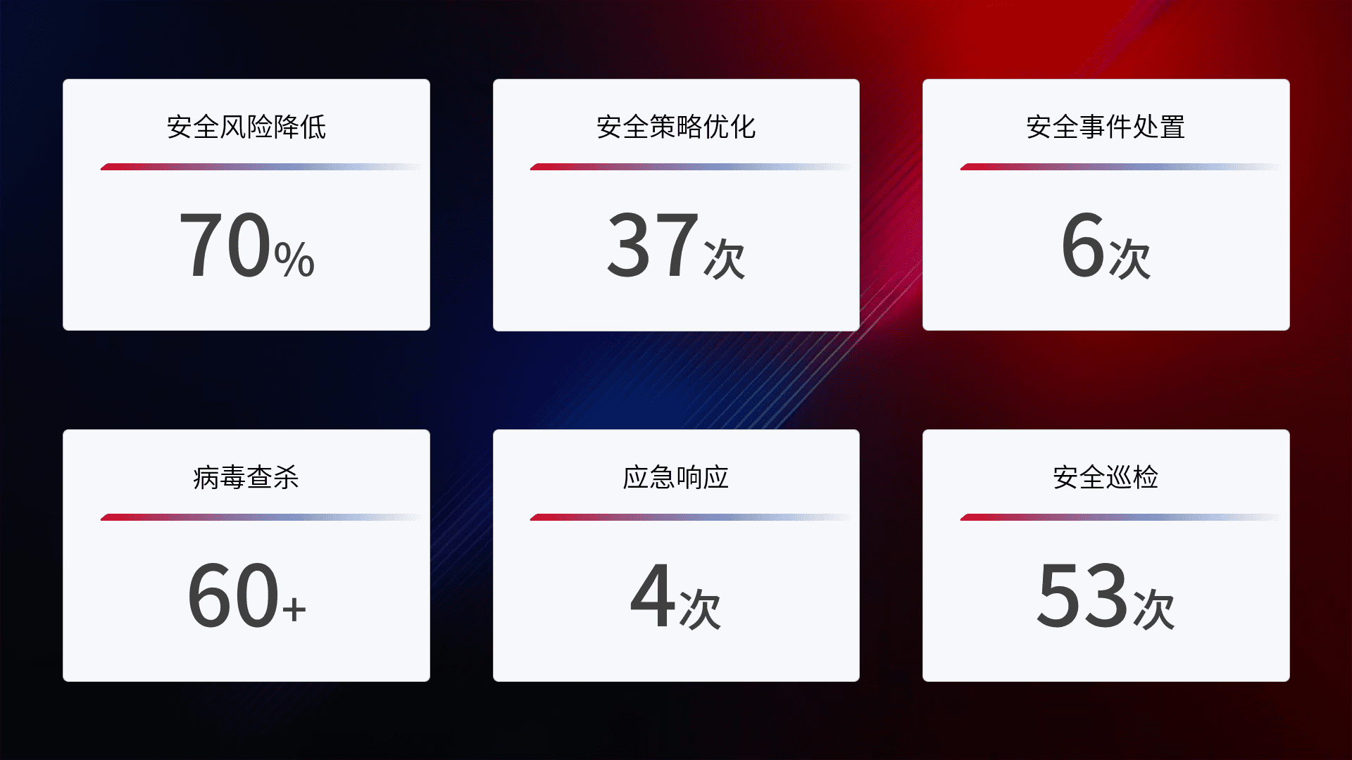 提供全面的安全事件报告体系,,包括处置报告、、周报、、季度和年度总结,,,,结合持续监控,,帮助客户深入了解网络安全状况。。。